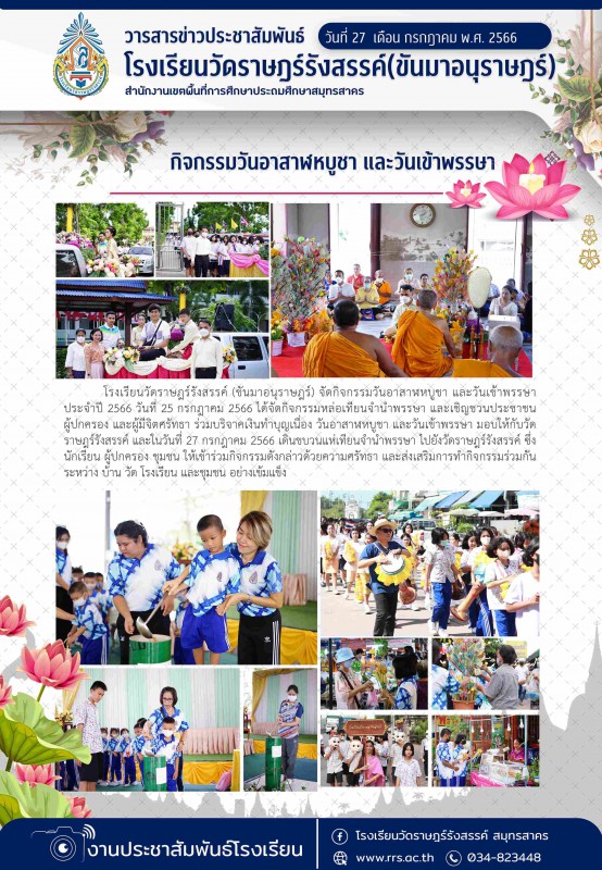โรงเรียนวัดราษฎร์รังสรรค์ (ขันมาอนุราษฎร์) จัดกิจกรรมวันอาสาฬหบูชา และวันเข้าพรรษา ประจำปี 2566 วันที่ 25 กรกฎาคม 2566 ได้จัดกิจกรรมหล่อเทียนจำนำพรรษา และเชิญชวนประชาชน ผู้ปกครอง และผู้มีจิตศรัทธา ร่วมบริจาคเงินทำบุญเนื่อง วันอาสาฬหบูชา และวันเข้าพรรษา มอบให้กับวัดราษฎร์รังสรรค์ และในวันที่ 27 กรกฎาคม 2566 เดินขบวนแห่เทียนจำนำพรรษา ไปยังวัดราษฎร์รังสรรค์ ซึ่งนักเรียน ผู้ปกครอง ชุมชน ให้เข้าร่วมกิจกรรมดังกล่าวด้วยความศรัทธา และส่งเสริมการทำกิจกรรมร่วมกันระหว่าง บ้าน วัด โรงเรียน และชุมชน อย่างเข้มแข็ง